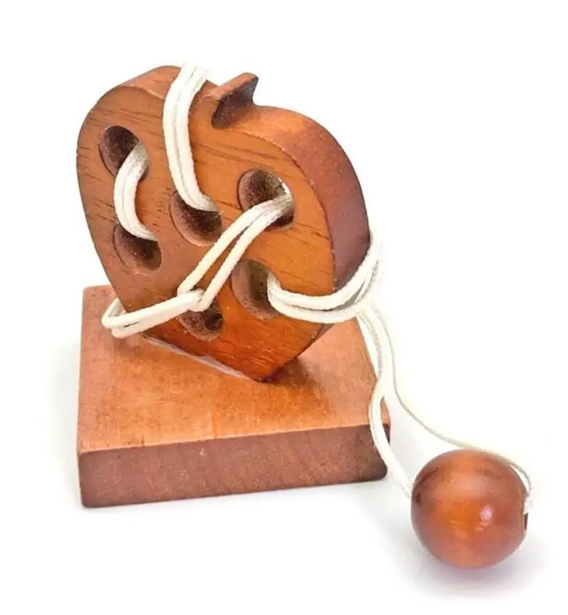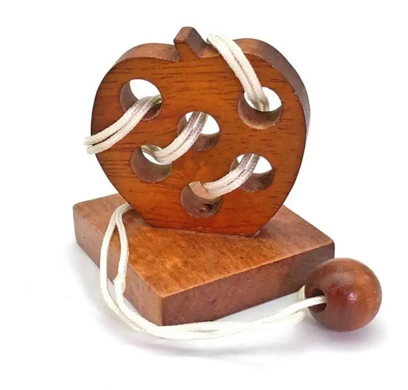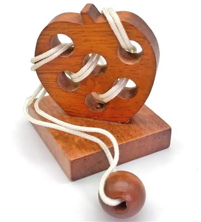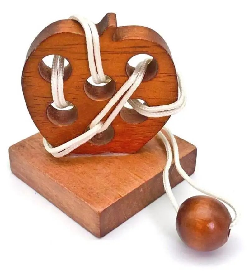 Beskrivelse: Dette epleformede IQ-treperlepuslespillet er en morsom utfordring for både barn og voksne. Målet med dette puslespillet er å frigjøre tauet fra spillet og deretter sette dem sammen igjen. Puslespillet er laget av tre og tau, og det har kompakt dimensjoner som gjør det perfekt for å ta med seg overalt.